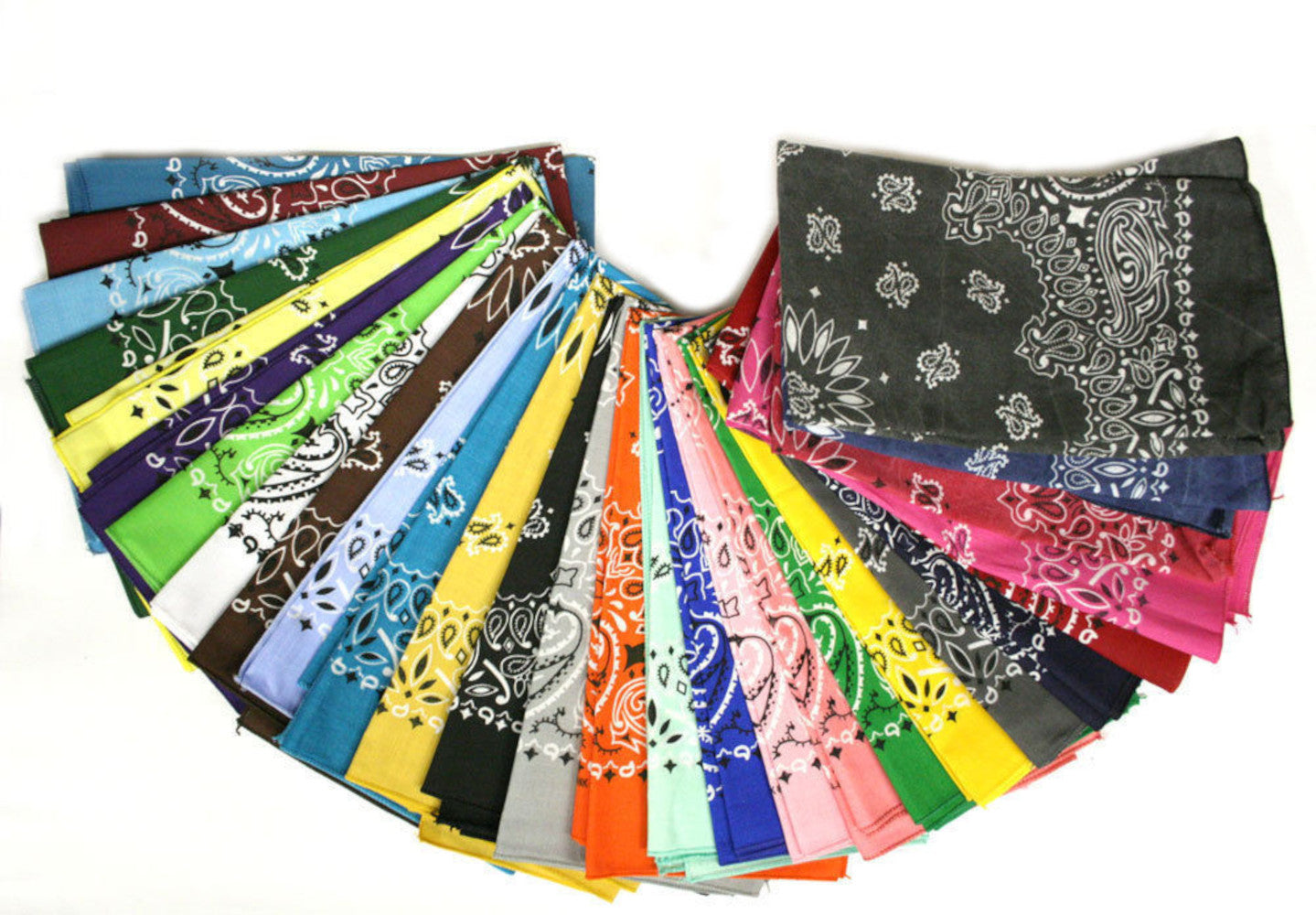 Consists of random colors of fashion paisely bandanas size could range in the 21" x 21" to 22" x 22". Made in the USA Color assortment is random not necessarily as shown in photo.